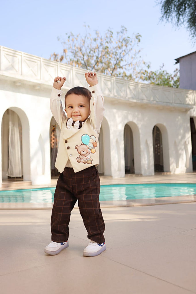 - Description-White Shirt , Wooden Button on Shirt, Matching Bow Tie,Beige waist coat with soft lining,Brown Check Pant,Motifs on waist coat,Beige Waist Coat with White Shirt,Beown Check Pant Beige Waist Coat Set For Boys.