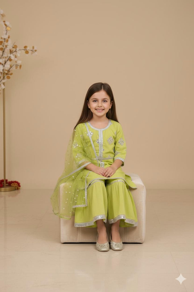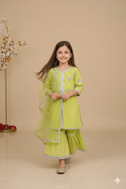- Description- Cotton emb kurta with mulmul cotton sharara. Detailed with Emb and lace emblishments