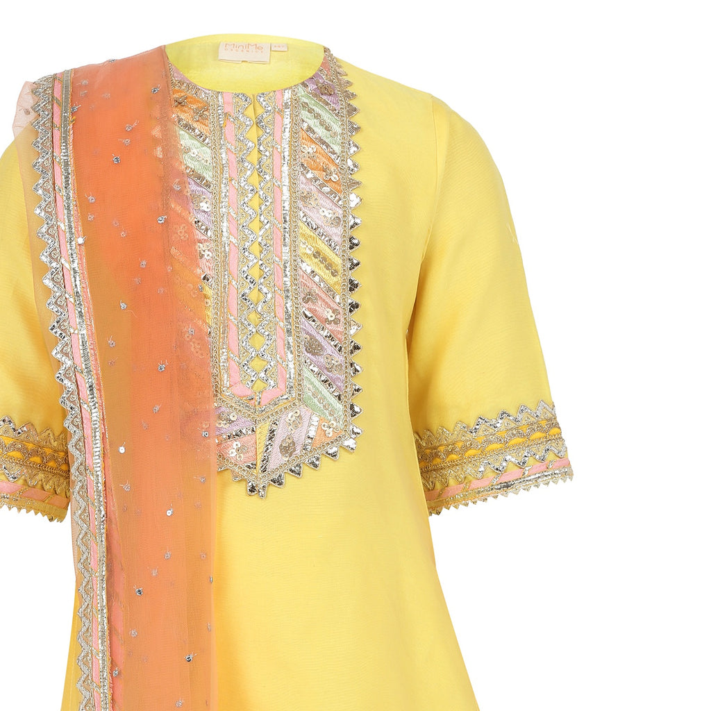 - Description- Chanderi Silk Kurta and Sharara with Gota Detailing and Net Dupatta