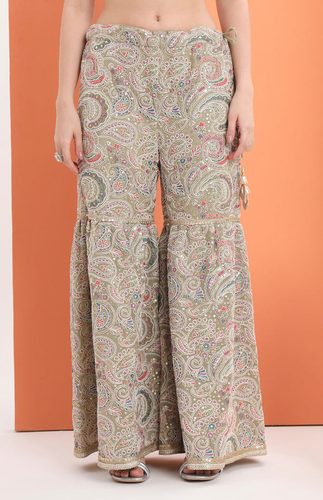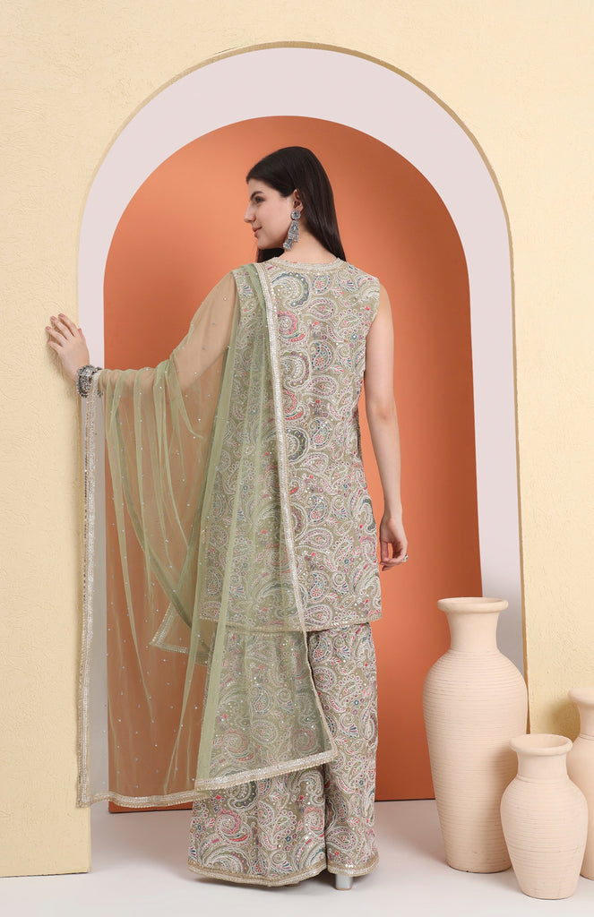 - Description- Embroidered Georgetta Kurta and Sharara Paired with Soft Net Dupatta