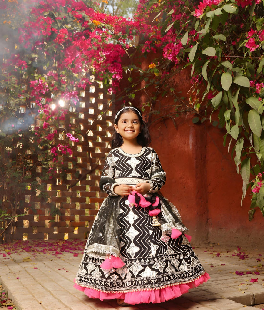- Description-Make a statement of timeless elegance with our Black Gota Embroidered Anarkali for girls. This exquisite Anarkali features intricate gotta embroidery on a cotton base lining, complemented by a round neck with a back zip for ease of wear. The full sleeves add a touch of grace, while the pink net frills and pearls finishing create a luxurious and enchanting look. Complete with a detachable belt with tassels and a net dupatta with silver finishing, this Anarkali is perfect for special occasions or festive celebrations, showcasing impeccable craftsmanship and refined style. Styling Tips: Pair this timeless Anarkali with delicate silver or pearl jewelry, embellished sandals or juttis, and a sleek hair updo to let the intricate embroidery and luxurious details take center stage.Blace Gota Embroidered Anarkali.