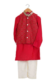 - Description- We always strive to produce unique, lovingly handcrafted and practical apparel. And we use only GOTS Certified Organic cotton and the finest handwoven textiles. Our classic bandhgala with embroidered neck and gold print is complemented perfectly with matching kurta and contrast ivory pant. Most importantly, there is NO CHUBHI CHUBHI. The entire ensemble is buttery soft and perfect for children’s delicate skin.