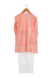 - Description- We always strive to produce unique, lovingly handcrafted and practical apparel. And we use only GOTS Certified Organic cotton and the finest handwoven textiles. Our fresh and modern kurta with zip neck and gota embellishment is complemented perfectly with ivory, relaxed fit pants. Most importantly, there is NO CHUBHI CHUBHI. The entire ensemble is buttery soft and perfect for children’s delicate skin.