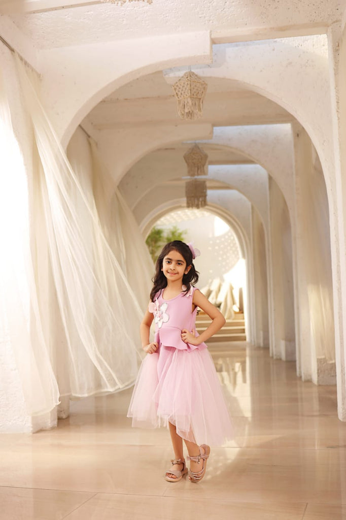 - Description-Lilac Neoprene,No lining,Hand made 3D Flowers on dress,detachable tales,Soft and Comfortable,Net Frill Lilac Neoprene Dress For Girls.