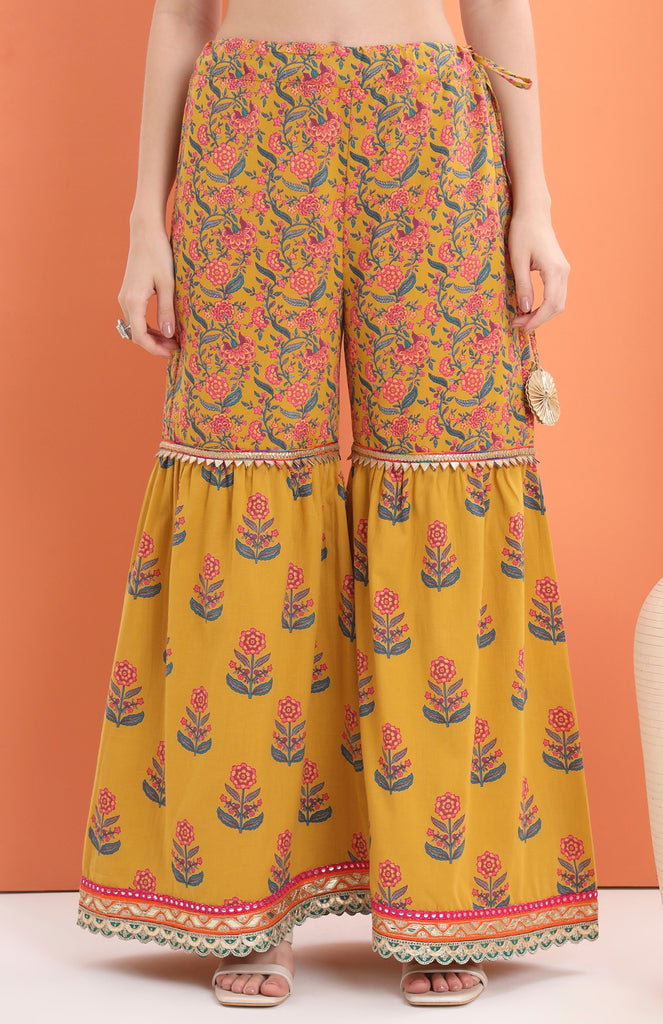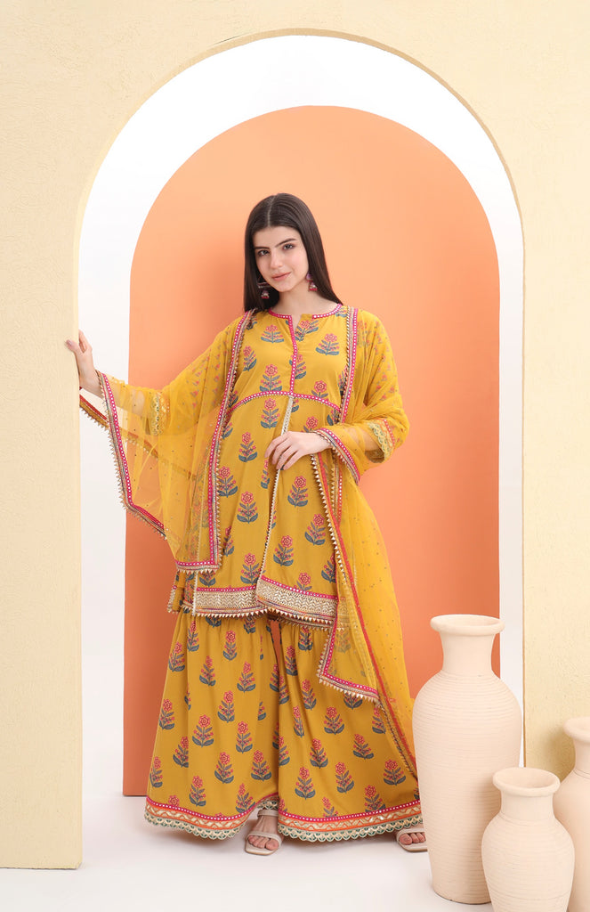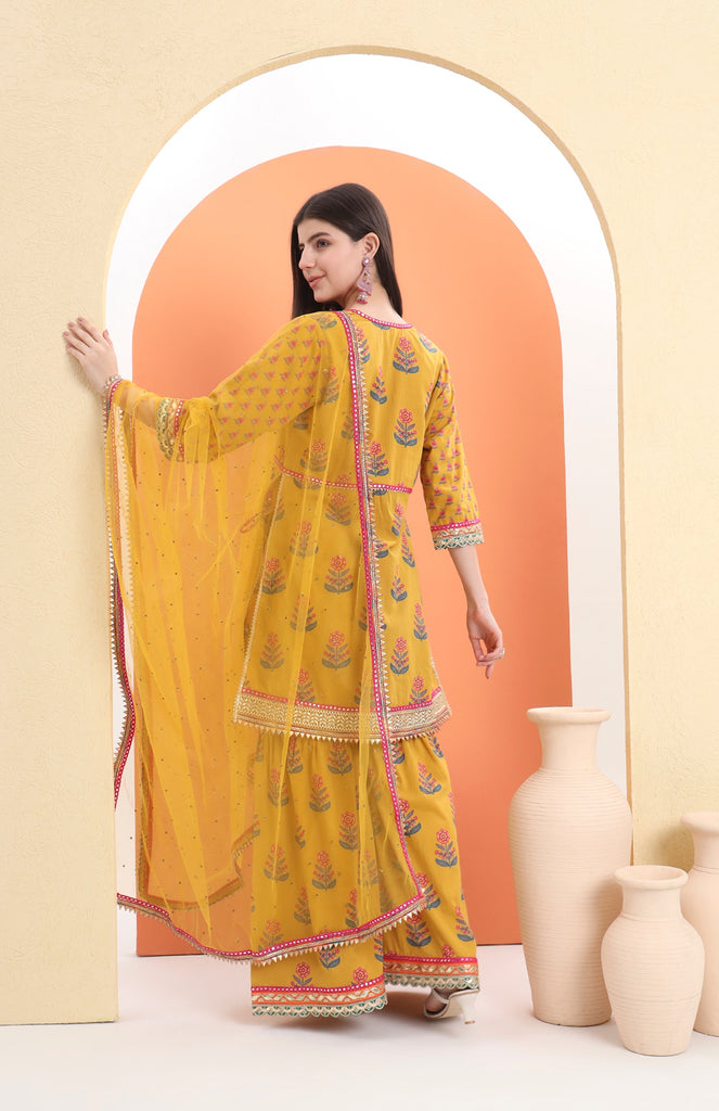 - Description- Block Printed Kurta and Sharara paired with Mulmul dupatta