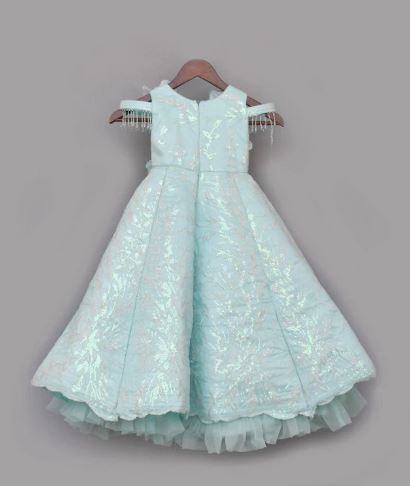 - Description-Embroidered Gown with soft lining,Round Neck and Back Zip,Drop Shoulder hanging with tassels 3D Flowers and Feathers on Yoke Cancan used, Blue Embroidery Gown.